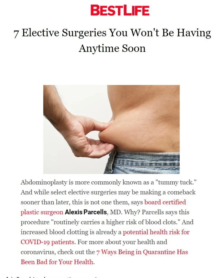 Abdominoplasty is more commonly known as a "tummy tuck." And while select elective surgeries may be making a comeback sooner than later, this is not one them, says board certified plastic surgeon Alexis Parcells, MD. Why? Parcells says this procedure "routinely carries a higher risk of blood clots." And increased blood clotting is already a potential health risk for COVID-19 patients. For more about your health and coronavirus, check out the 7 Ways Being in Quarantine Has Been Bad for Your Health.