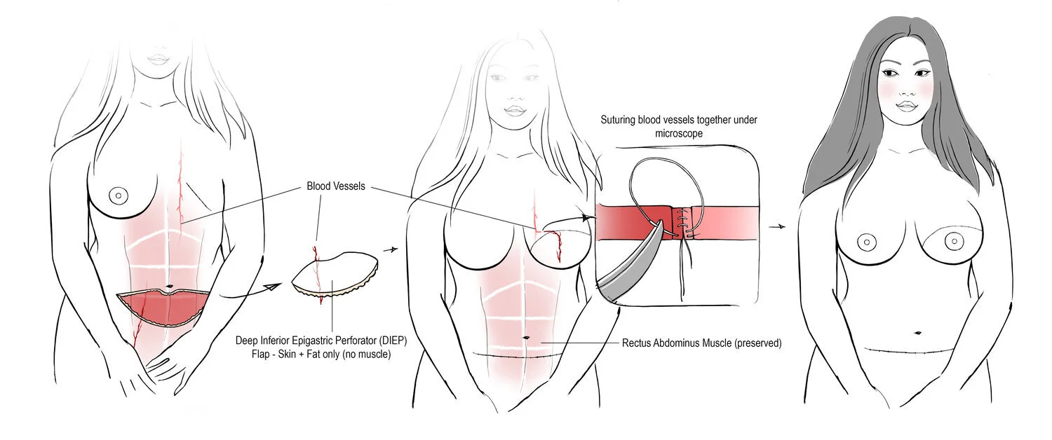 A DIEP flap is similar to a TRAM flap in that it utilizes the lower abdominal skin and fat. However, unlike the TRAM, this flap spares rectus abdominus (“Ab”) muscle. The blood supply for this flap is based on branches of the inferior epigastric vessels, hence the name of this flap (Deep Inferior Epigastric Perforator). These blood vessels are detached and reattached under the microscope. A breast shape is then created using this tissue.